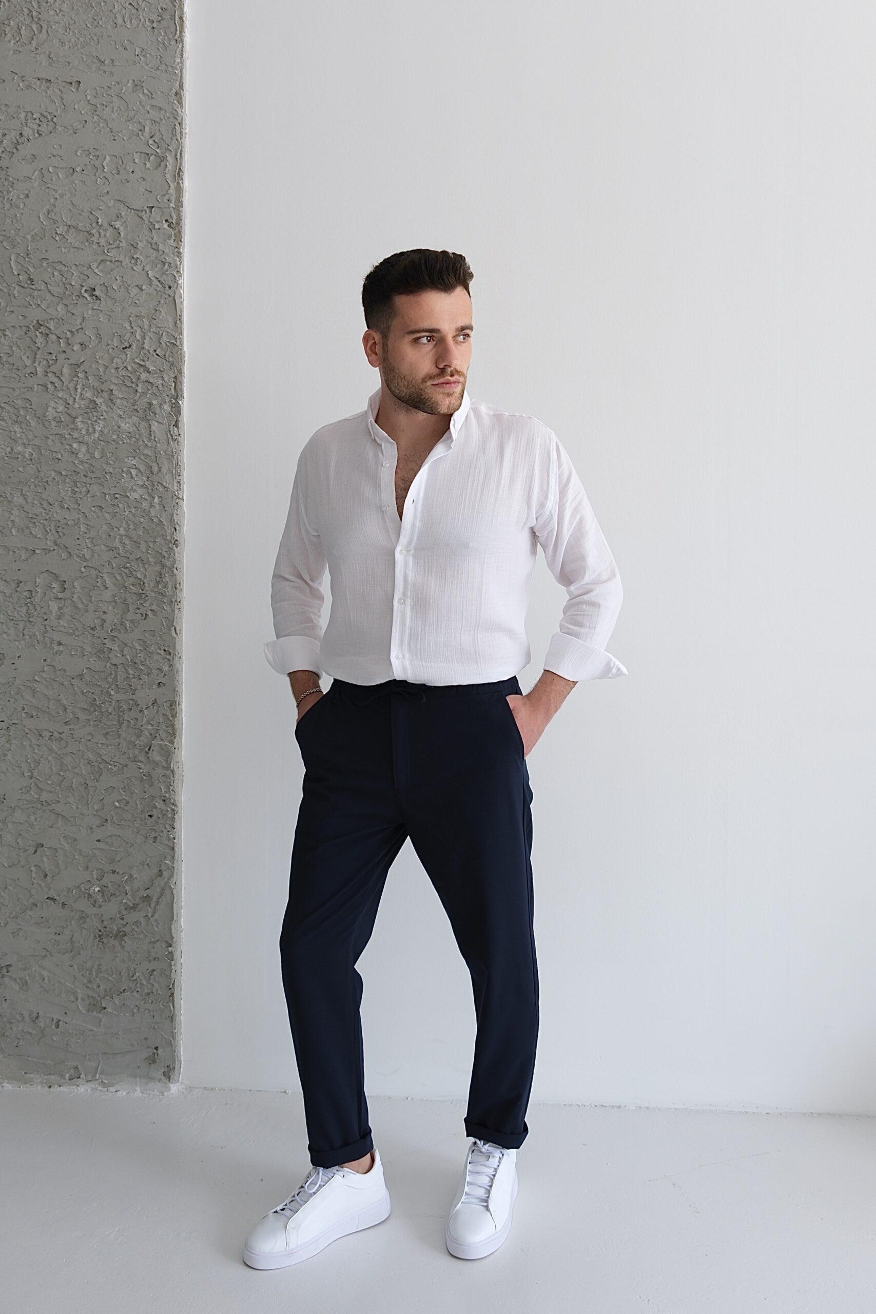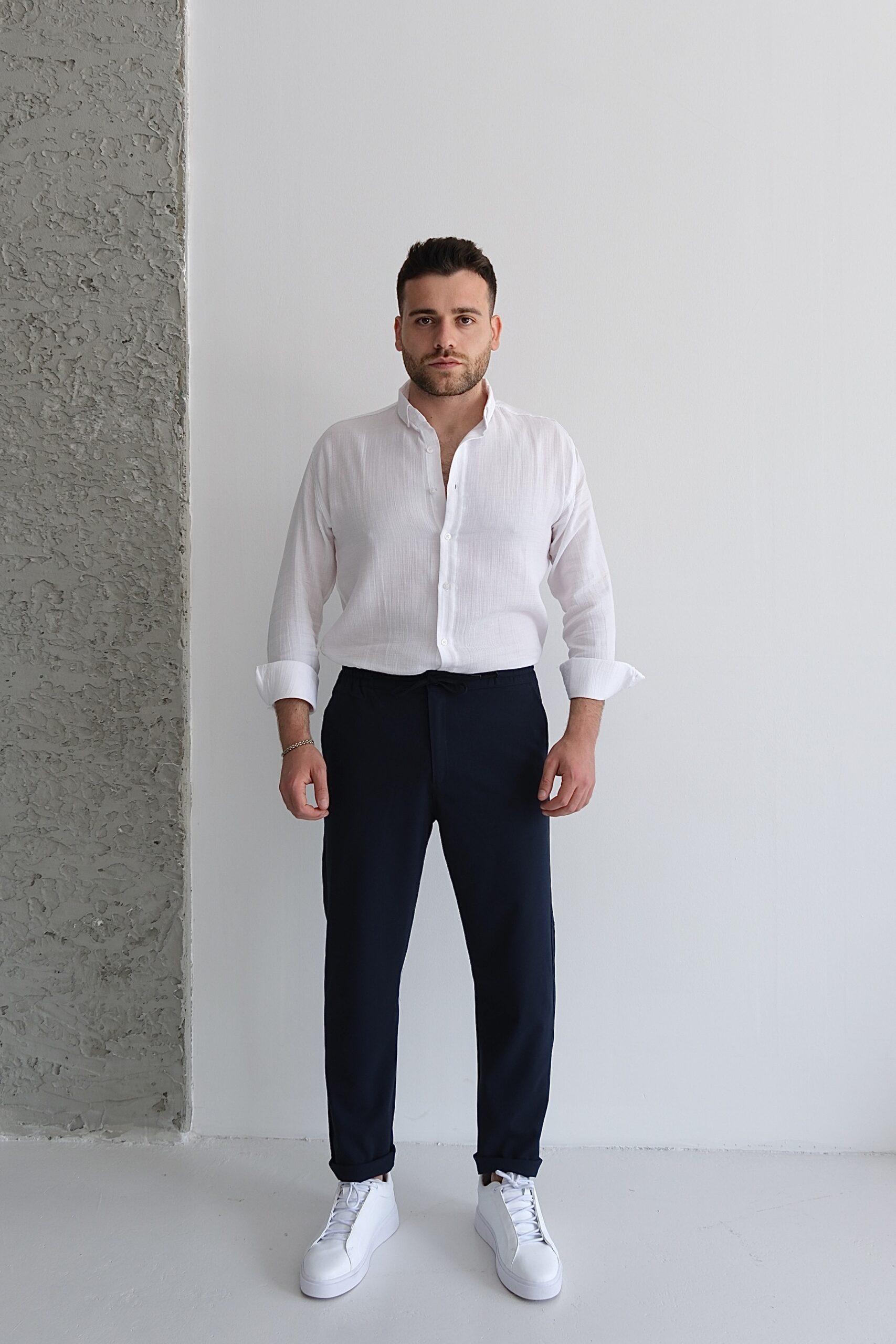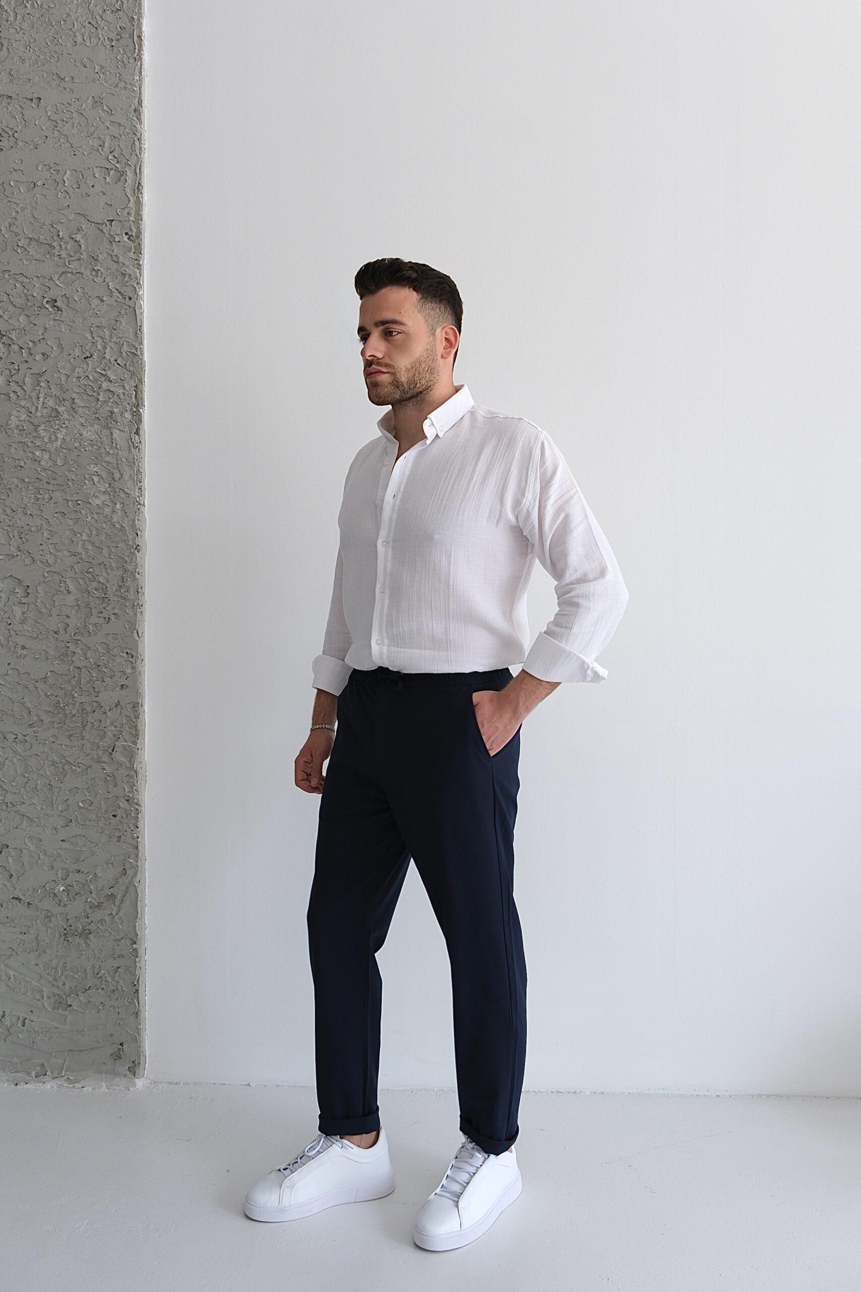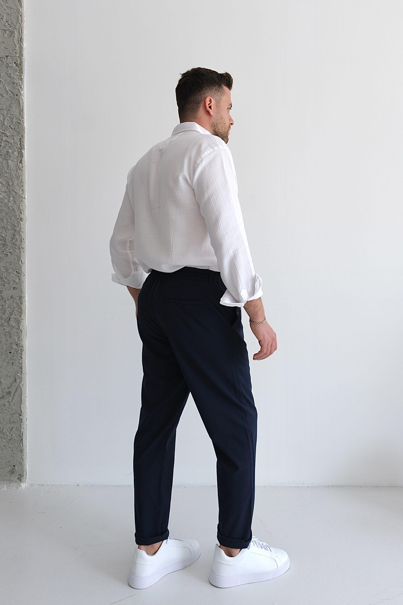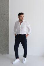 Slim fit kesimi vücuda otururken, duble paça detayı modern bir dokunuş katar.